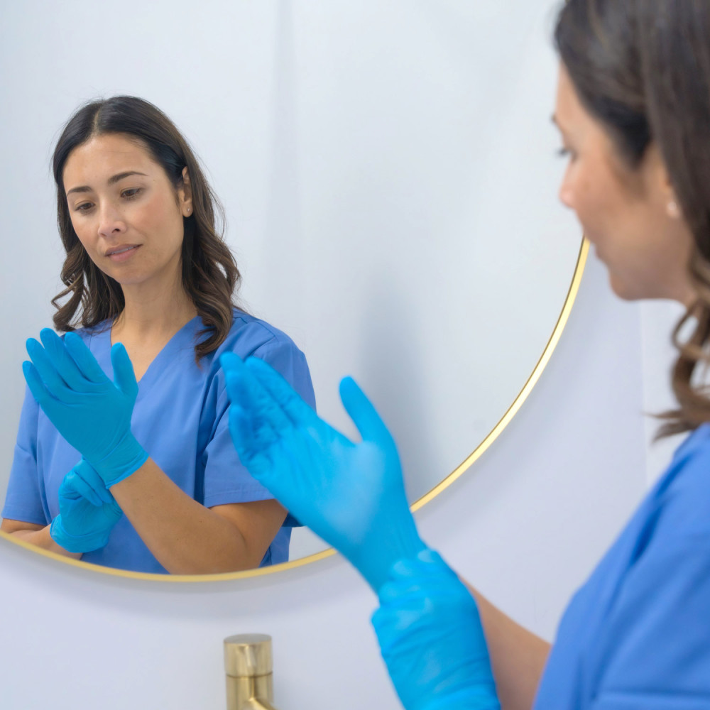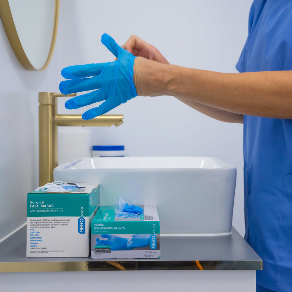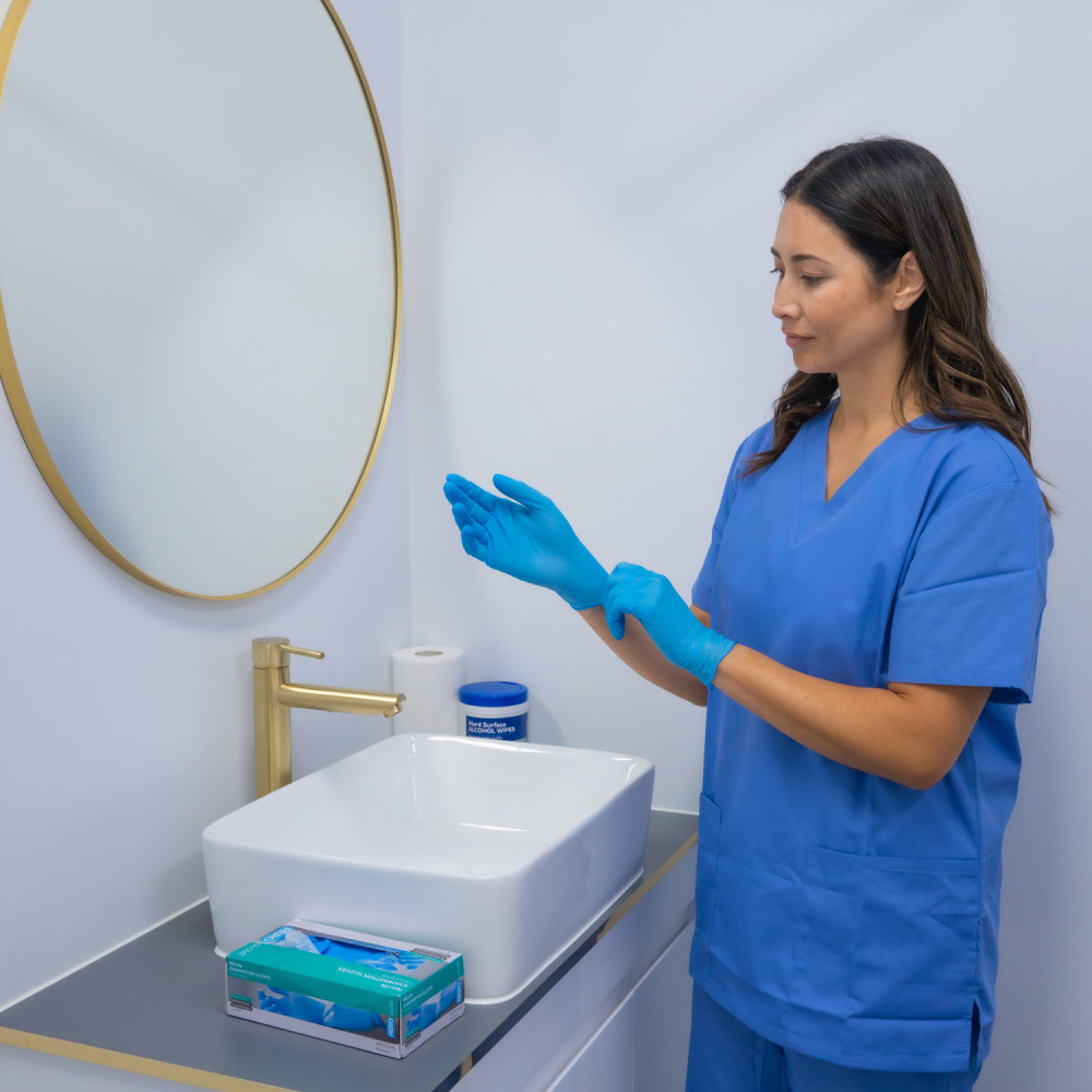AEROGLOVE Nitrile Powder‑Free Gloves deliver dependable barrier protection for clinical, workplace and everyday tasks where hygiene and dexterity are essential. Constructed from durable nitrile, they balance flexibility with puncture strength to help protect hands during routine examinations, cleaning down equipment and handling wound dressings. An anatomically shaped, ambidextrous design supports a natural feel on either hand, enabling quick donning and confident movement without unnecessary bulk. The powder‑free finish supports clean handling by reducing surface residue on skin, instruments and surfaces, while a textured surface is designed to provide reliable grip in both wet and dry conditions. Latex‑free construction suits users who are sensitive to natural rubber latex, broadening suitability across healthcare, community and personal use. A blue colour option assists fast visual checks so splits can be identified and gloves replaced promptly to maintain good practice.