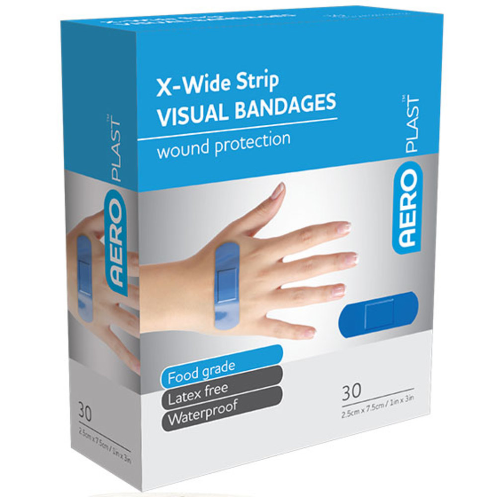 AEROPLAST Premium Visual is a blue, visually detectable adhesive bandage range engineered for food preparation, catering, and processing environments where fast identification matters. The vibrant blue backing contrasts clearly with food and stainless-steel surfaces to support routine hygiene checks. Each dressing is latex‑free and hypo‑allergenic to suit diverse teams and sensitive skin while maintaining dependable performance throughout demanding shifts. Sterile, single‑use, individually wrapped dressings protect product integrity until application.