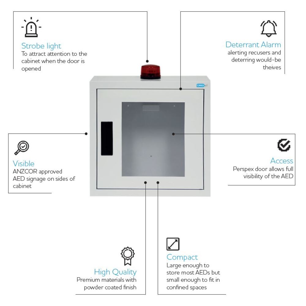 The CC-50 is an AED wall cabinet with an alarm, strobe light, and ANZCOR approved signage. Its design allows for full visibility of the AED and is compact enough to fit in confined spaces.
