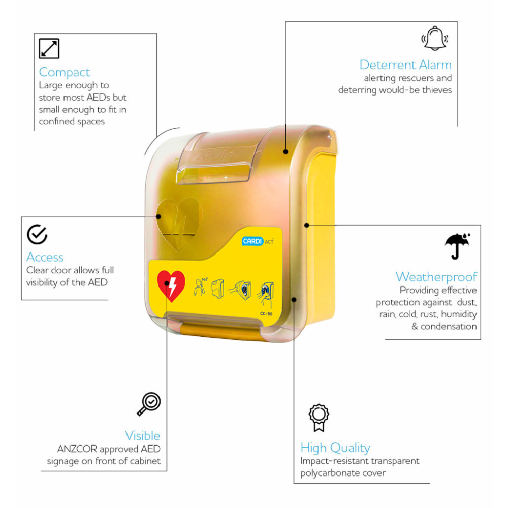 - High visibility design: clear polycarbonate door and prominent AED markings support rapid identification.