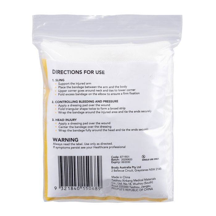 Triangular Cloth Bandage. For emergency treatment of fractures and wounds, and for supporting and immobilising injured limbs.