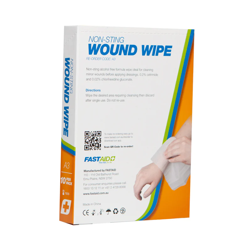 FastAid’s alcohol free non-sting wound wipe is designed to cleanse skin of minor injuries before applying dressings.