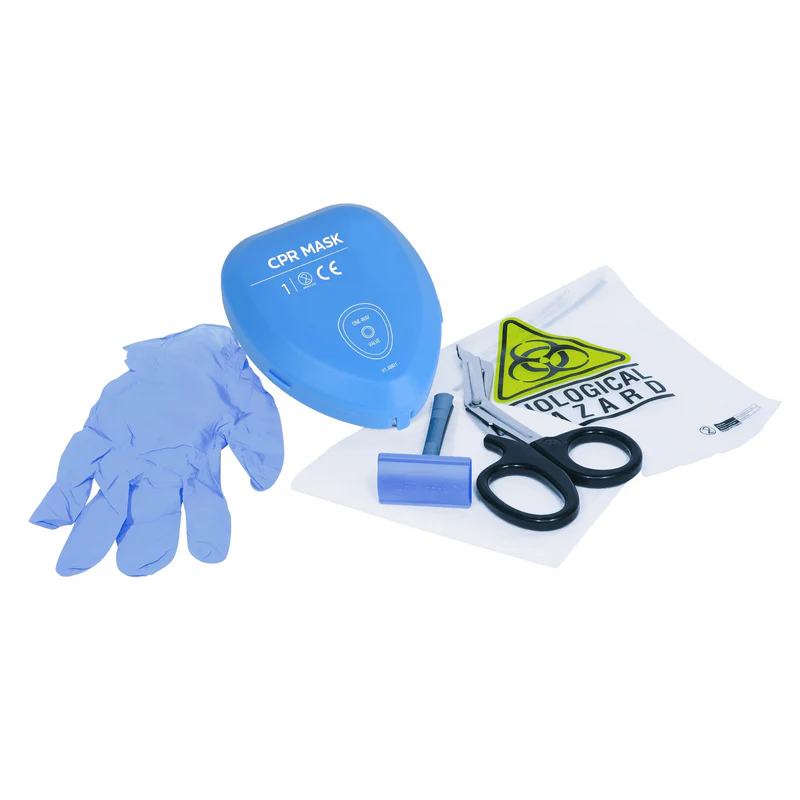 The pack comprises of a proper surgical razor designed to cope with tough hair, trauma shears for cutting clothing, a drying towel, 2 pairs of nitrile gloves, a hazardous waste disposal bag, and a hard cased CPR mask of premium quality (with an oxygen port if you are required to administer oxygen).