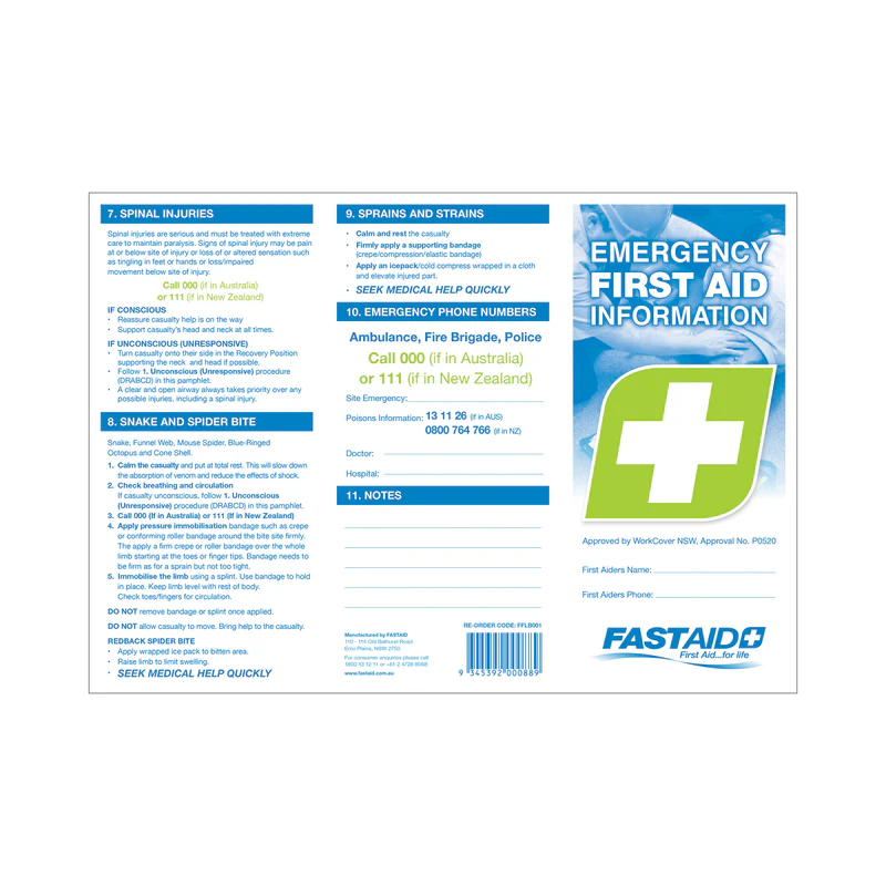 FastAid’s Emergency First Aid Information Booklet provides essential first aid information including DRSABCD, emergency phone numbers and other key first aid advice.